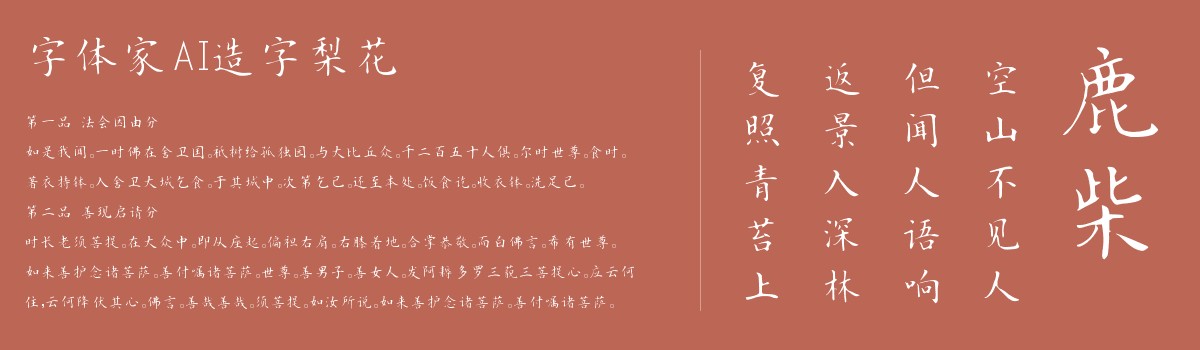 字体家AI造字梨花是一款由字体家AI神笔造字生成的艺术风格字体。手写楷书风格,笔画若隐若现,清新自然。适合用于一些广告标题、平面文案、海报标题、网页广告用字的编辑。