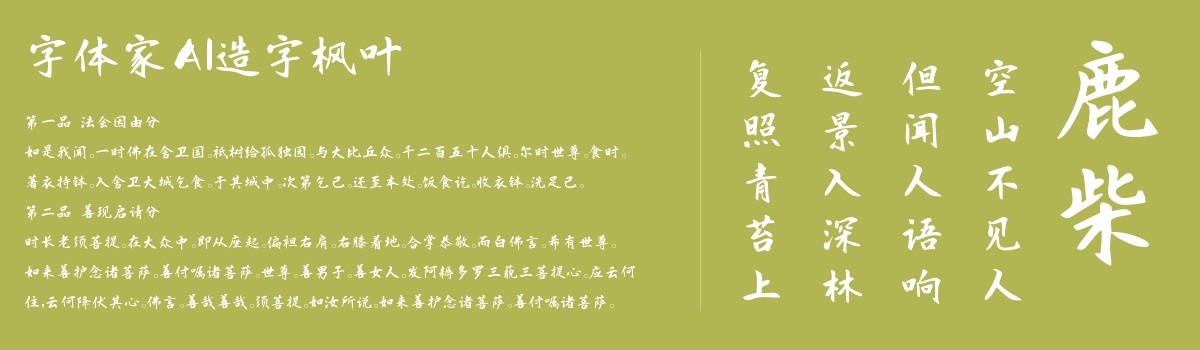 字体家AI造字枫叶是一款由字体家AI神笔造字生成的一款艺术字体,它巧妙地结合了行书的灵动和楷书的规整,书写的坚毅自然,很有古典诗书气质。比较适合用于艺术类装饰文字,海报、网页、广告设计,室内装饰,平面标题设计、食品包装、品牌标志等。