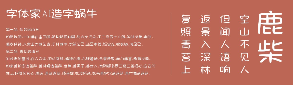 字体家AI造字蜗牛是一款由字体家AI神笔造字生成的艺术字体,笔画圆润可爱,整体字形方中带圆,轻松且活泼。适合用于一些广告标题、平面文案、海报标题、网页广告用字的编辑。