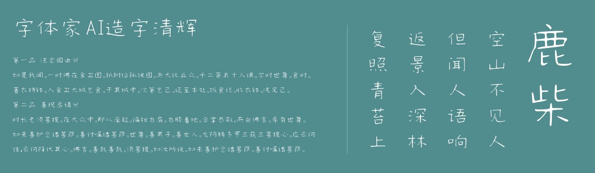 字体家AI造字清辉是一款由字体家AI神笔造字生成的艺术字体,笔画横细竖细,转折处呈方折。结构端庄匀称,重心平稳。整体字形小巧利落,线条清晰流畅,无冗余装饰,兼具传统韵味与现代规整感。适合用于一些广告标题、平面文案、海报标题、网页广告用字的编辑。