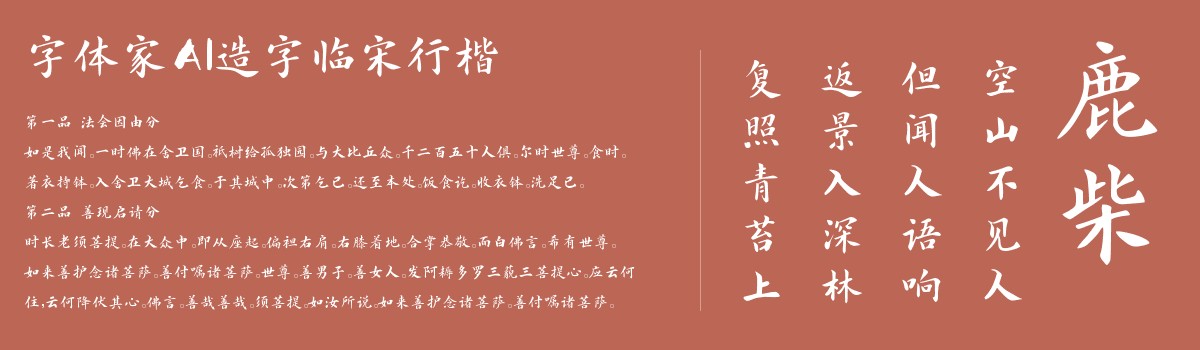 字体家AI造字临宋行楷是一款由字体家AI神笔造字生成的一款艺术字体,这款字体像温润的手写毛笔字,笔画起笔沉稳如轻按宣纸,收笔利落似笔尖轻提。横画微斜带舒展,像风中轻扬的丝带;竖画挺直却不僵硬,如竹节般有弹性。既有楷书的端庄骨架,又有行书的手写温度,书卷气中透着自在。比较适合用于艺术类装饰文字,海报、网页、广告设计,室内装饰,平面标题设计、食品包装、品牌标志等。