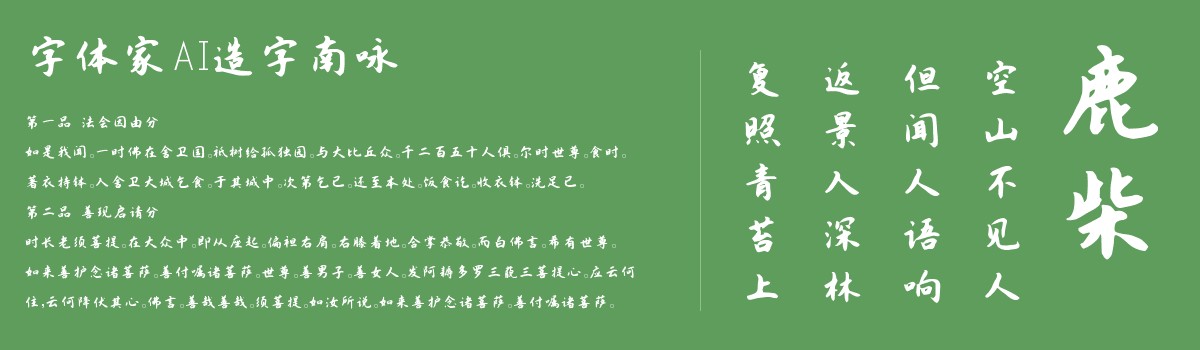 字体家AI造字南咏是一款由字体家AI神笔造字生成的一款艺术字体,笔画流畅如行云,起笔轻顿似指尖触纸,收笔舒展若微风拂柳,转折圆润无棱角。线条粗细自然过渡,不刻意均匀却显手写从容。整体温润如玉,有书写灵动生气,又含沉静书卷韵,仿佛能触到笔尖在纸上缓缓游走的细腻轨迹。比较适合用于艺术类装饰文字,海报、网页、广告设计,室内装饰,平面标题设计、食品包装、品牌标志等。