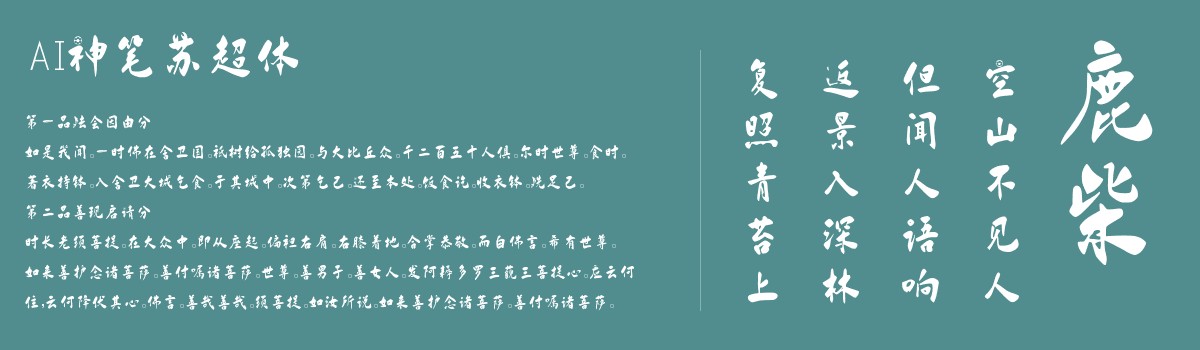 AI神笔苏超体是一款由字体家AI神笔造字生成的艺术字体,笔画似毛笔轻提重按,起笔藏锋如指尖轻触纸面的柔缓,收笔露锋若丝线渐细飘远。横画舒展如平展布帛,中段饱满有弹性,竖画挺拔似立木,直中带微弧显韧劲。转折处圆转无棱角,如卵石相触的温润。偶见飞白如发丝轻扬,笔画边缘有自然晕染感。骨架方正却藏灵动,刚柔相济,似能触到笔尖在纸上的轻重提按,气韵连贯如流水行舟。将笔画稍作修改,增添时尚活泼的感觉,古今结合。适合用于一些广告标题、平面文案、海报标题、网页广告用字的编辑。