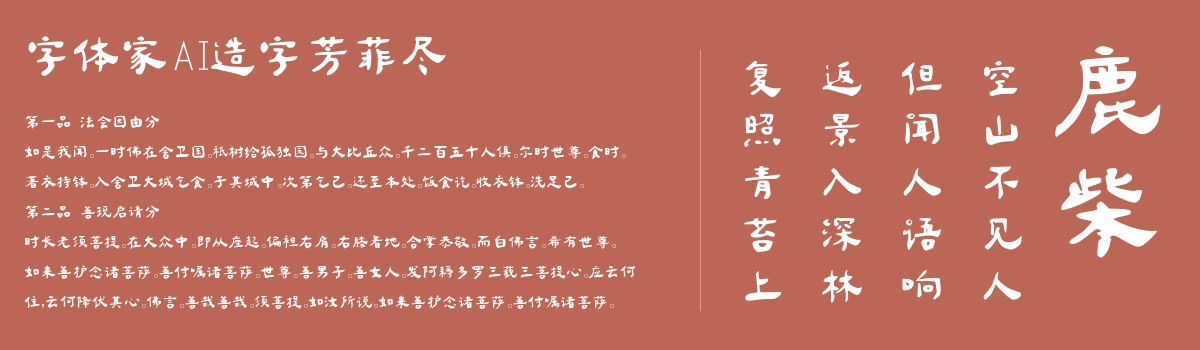 字体家AI造字芳菲尽是一款由字体家AI神笔造字生成的艺术字体,整体结构方正端庄,笔画粗细对比鲜明,刚硬中藏着细微的手写灵动——横细竖粗的宋体骨架里,透着笔画转折处的柔和过渡,沉稳如古碑,清雅若墨竹。适合用于一些广告标题、平面文案、海报标题、网页广告用字的编辑。
