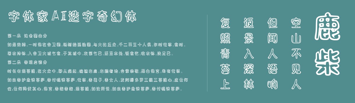 字体家AI造字奇幻体是一款由字体家AI神笔造字生成的一款艺术字体。笔画以黑体为基底,空心设计。笔画两侧有波浪状曲线装饰,折角处呈圆弧过渡而非直角。部分笔画中段融入星形或月牙形镂空设计,线条粗细均匀却在转折处微微加粗,似有光晕包裹。整体结构饱满偏圆润,重心略高,给人轻盈灵动又带神秘奇幻的感觉,仿佛笔画由星光编织而成。比较适合用于艺术类装饰文字,海报、网页、广告设计,室内装饰,平面标题设计、食品包装、品牌标志等。
