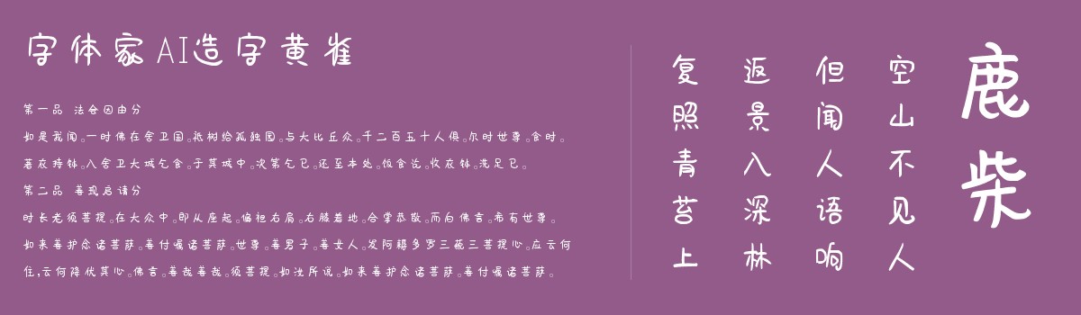 字体家AI造字黄雀是一款由字体家AI神笔造字生成的艺术字体,笔画粗细均匀,起笔收笔呈圆角,线条流畅柔和无尖锐棱角。字形方正饱满,结构舒展,重心平稳。笔画拐角处圆润过渡,无生硬折角,线条纯净无多余装饰。整体风格简约温润,兼具现代感与亲和力,给人平和舒适的触觉联想,如触摸打磨光滑的玉石,温润中透着规整。适合用于一些广告标题、平面文案、海报标题、网页广告用字的编辑。