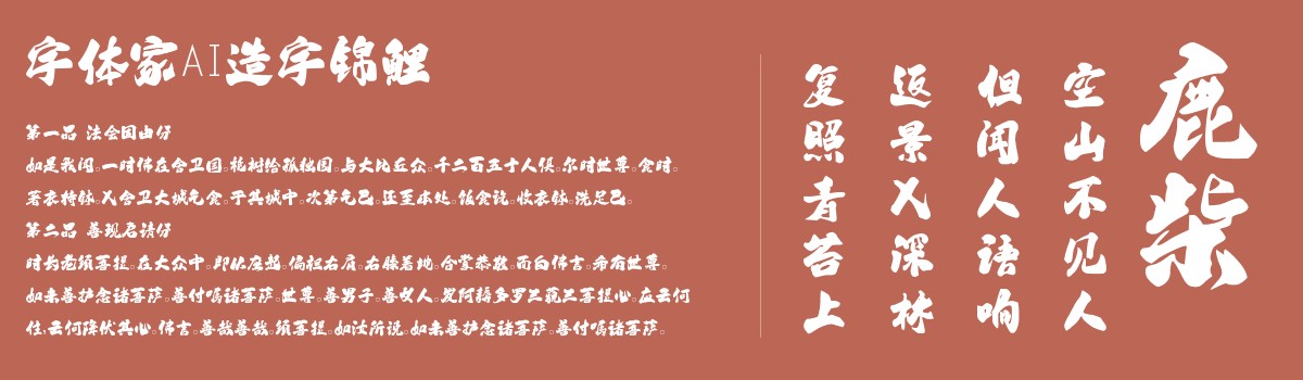 字体家AI造字锦鲤是一款由字体家AI神笔造字生成的艺术字体,这款字体带着毛笔书写的温润质感,笔画有自然的提按变化:起笔处略顿显沉稳,行笔间渐细见灵动,收笔时或轻挑出锋或圆润收尾,如墨在纸上自然晕染。结构端庄却不死板,横画平稳如担,竖画挺直似柱,撇捺舒展如羽翼轻展,转折处圆融无棱,像指尖轻转毛笔的柔和过渡。整体透着传统书法的典雅气韵,又有手写的鲜活生气,墨色浓淡间藏着呼吸感,像能触摸到毛笔在纸上游走的轨迹,稳重中带着飘逸,沉静里含着灵动。适合用于一些广告标题、平面文案、海报标题、网页广告用字的编辑。