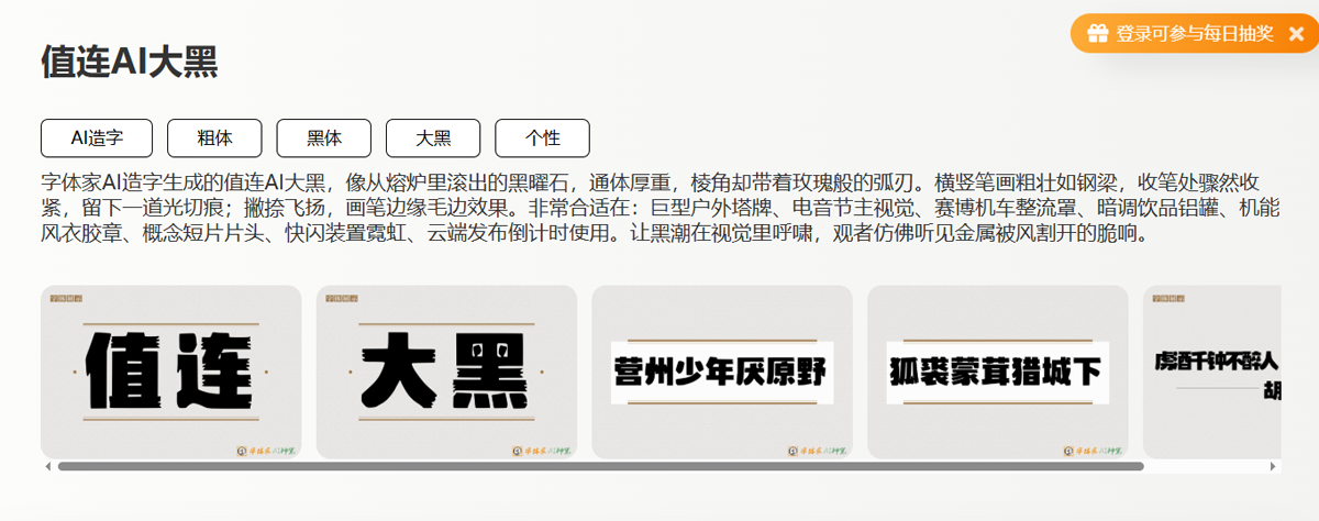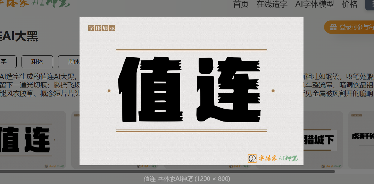 值连AI大黑的独特之处在于其横竖笔画如同钢梁般粗壮。这让文字如建筑般稳固,仿佛每一个字都有一座大厦的重量。笔画的收尾却骤然收紧,留下了一道如切割光刃的细痕,为整体增添了一丝锐利与精致。