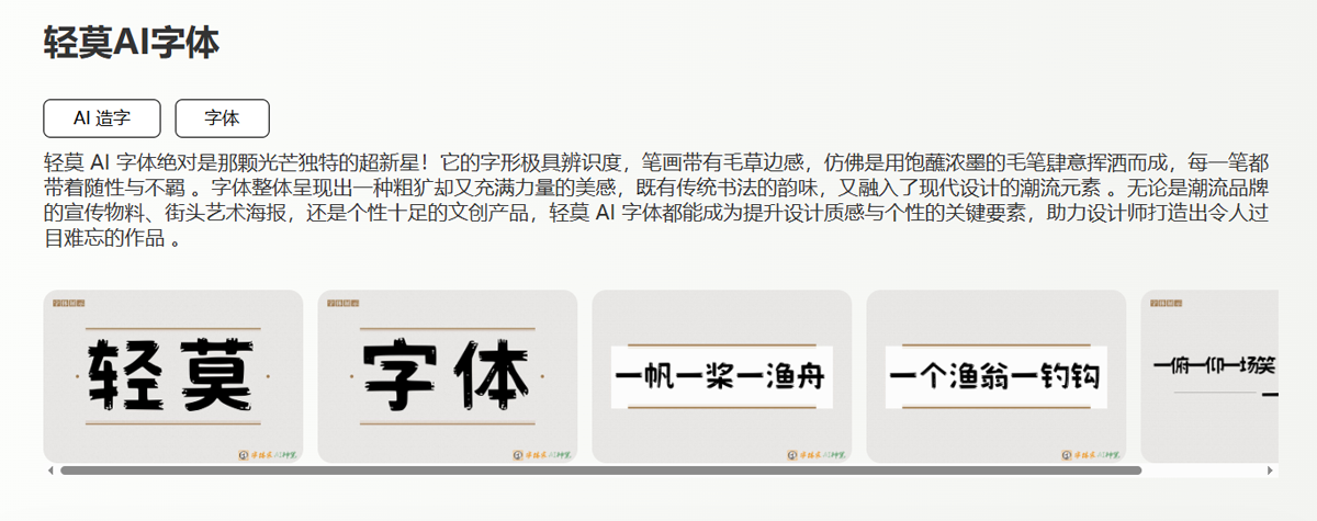 轻莫AI字体最引人注目的,便是其极具辨识度的字形。每一笔如同饱蘸浓墨的毛笔肆意挥洒,带有毛草边的感受,使得字体在视觉上充满动感和活力。这样的设计不仅仅停留在传统的美学之中,它巧妙地融入了现代潮流的元素,让人感受到一种粗犷而不羁的美感。