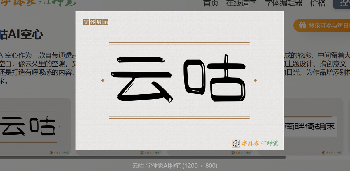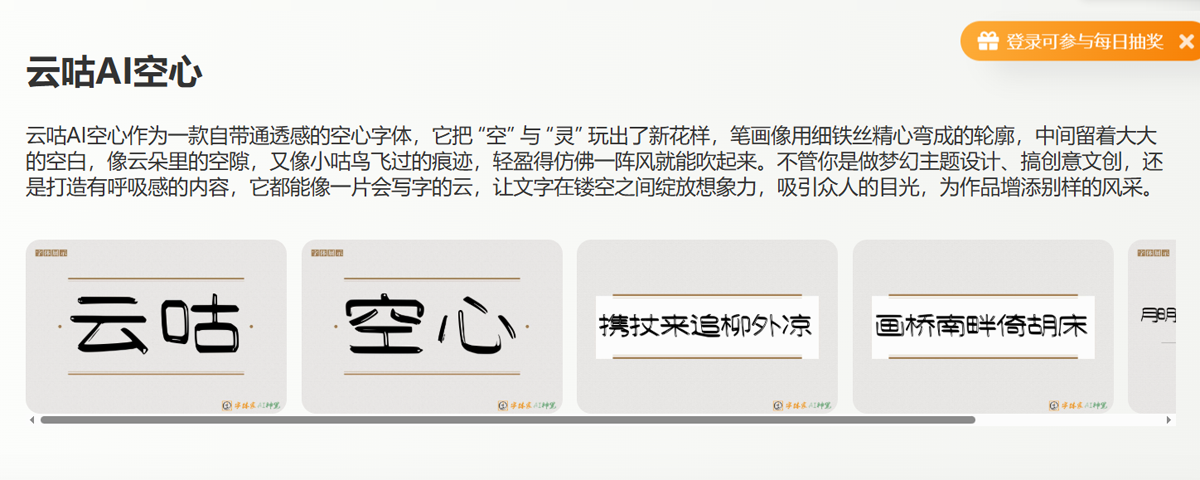 在数字设计的浩瀚星空中,一款名为 “云咕AI空心” 的字体正悄然掀起一阵轻盈的风潮。它以独特的“空”与“灵”为核心,将汉字的形体之美推向了一个充满想象力的新境界——笔画如细铁丝精心弯折而成的轮廓,中间留出舒展的空白,仿佛云朵间隙中的光芒,又似飞鸟掠过时留下的痕迹。
