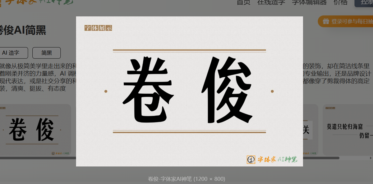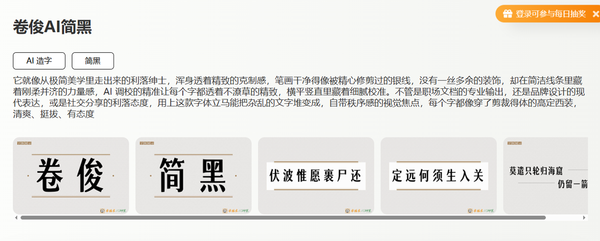 当AI技术深入字体设计这一传统艺术领域,卷俊AI简黑证明了算法不仅能提升效率,更能创造出具有深度美学价值的产品。在这个文字无时无刻不在传递价值的时代,为你的内容选择一款如高定西装般得体的字体,或许是最具智慧的形象投资。