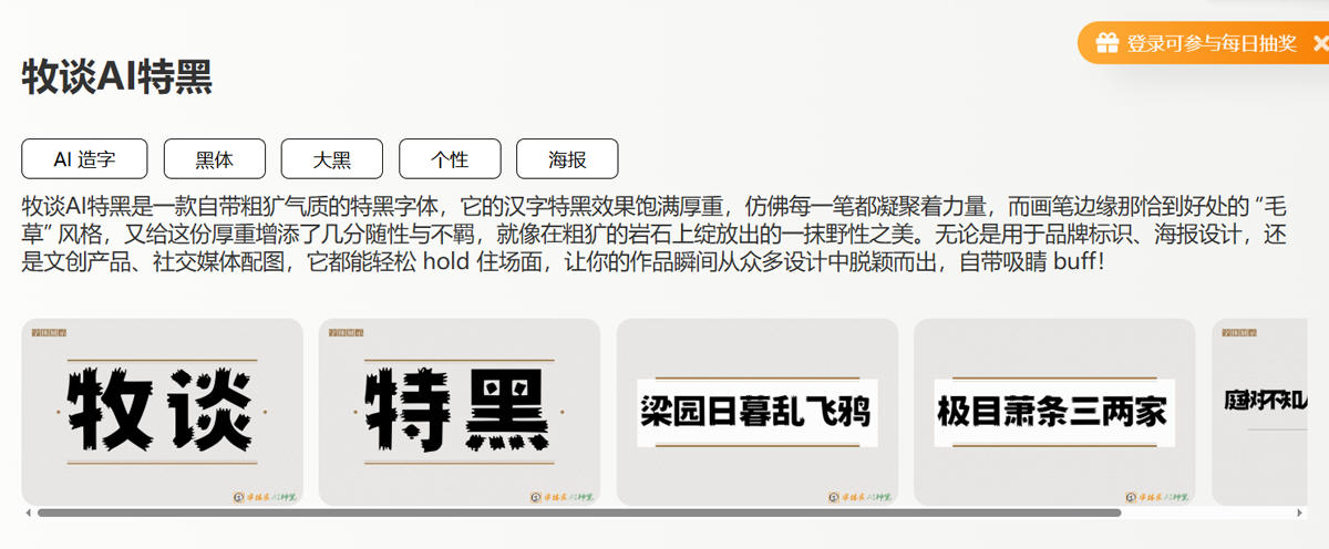 文创产品:当它出现在文创设计中,又会产生奇妙的化学反应。一本手账的封面、一张明信片的标题、一个帆布袋上的印花——牧谈AI特黑用它的粗犷,平衡了文创产品过于甜美的可能,创造出一种“粗粝的温柔”,既有文艺气息,又不失个性态度。