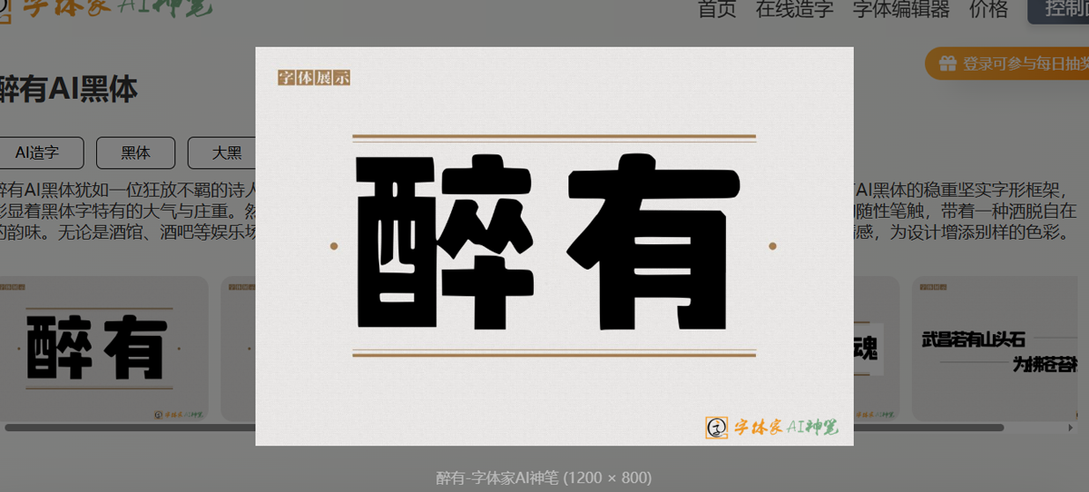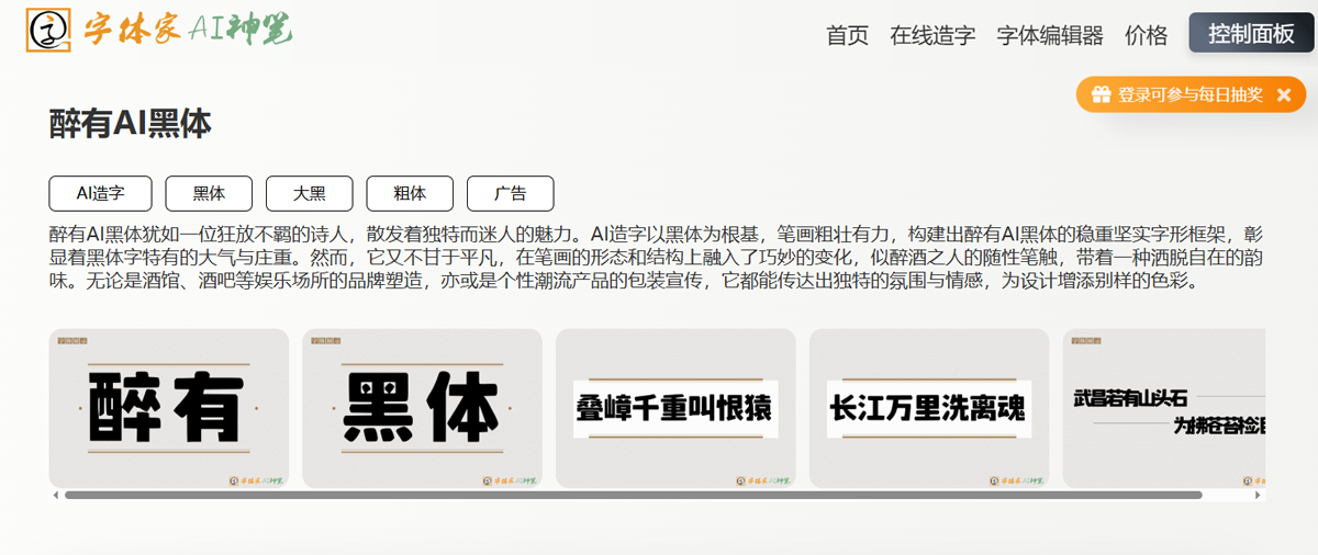 醉有AI黑体之所以令人印象深刻,正在于它同时承载了黑体的庄重与醉态的狂放。AI造字没有走向冰冷的完美,而是选择在理性结构中保留人性化的“醉意”。对于希望在设计中兼顾辨识度与情感表达的设计师而言,这款字体不是一种工具,而是一位可以对话的创作伙伴。